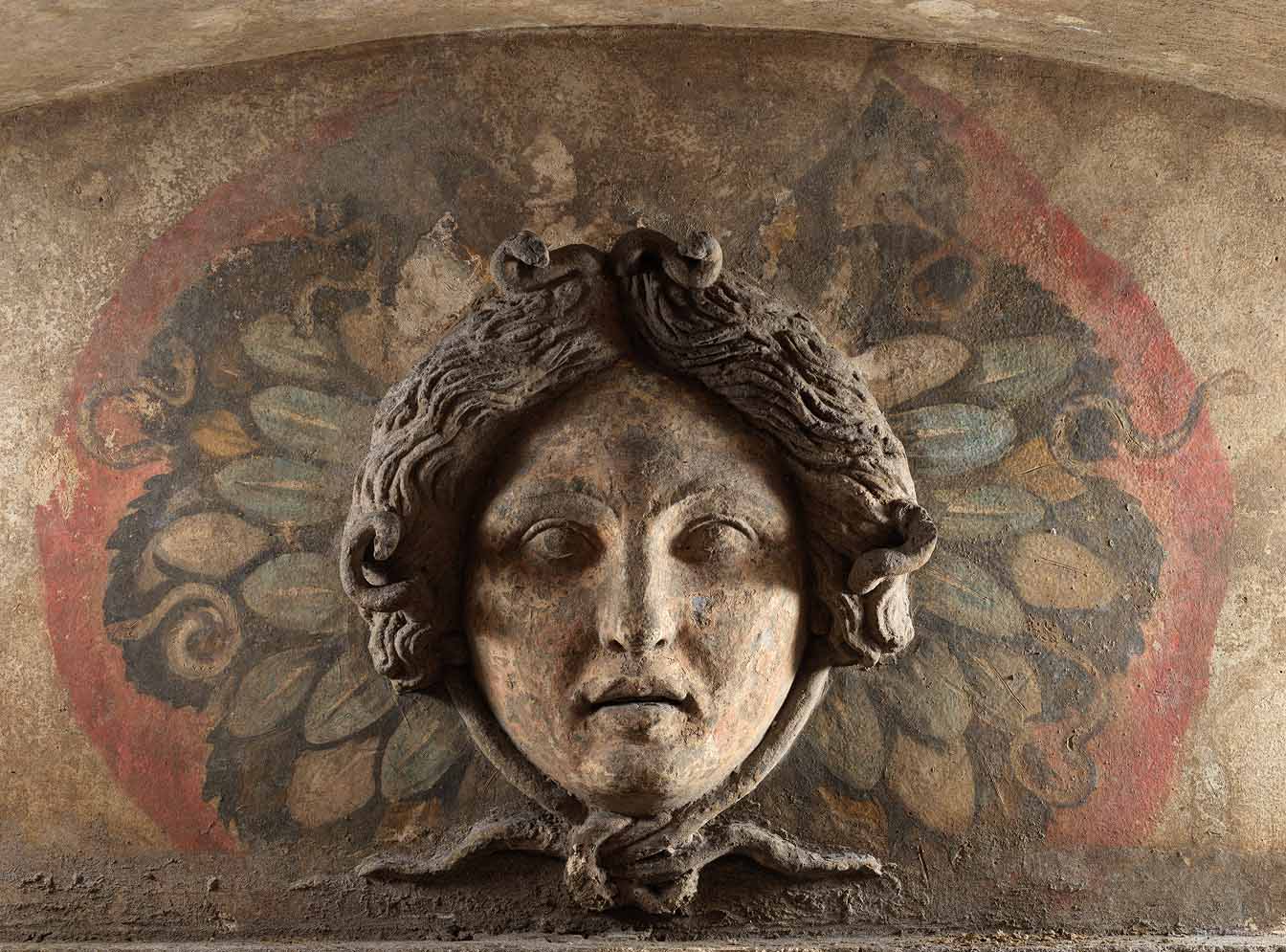 Each hypogeum consists of an upper chamber intended for funeral rites and a lower one where the bodies were interred, laid out on beds painted with vibrant colors like red, blue, and yellow. The best-preserved hypogeum features a monumental entrance with columns and a ceiling decorated with Ionic friezes and figured motifs (griffins, flowers, human faces). In the lower chamber, a relief of Medusa stands out, along with frescoes representing a rich funerary collection, with scenes of Dionysus and Ariadne—symbols linked to rebirth and the mystery of life and death.